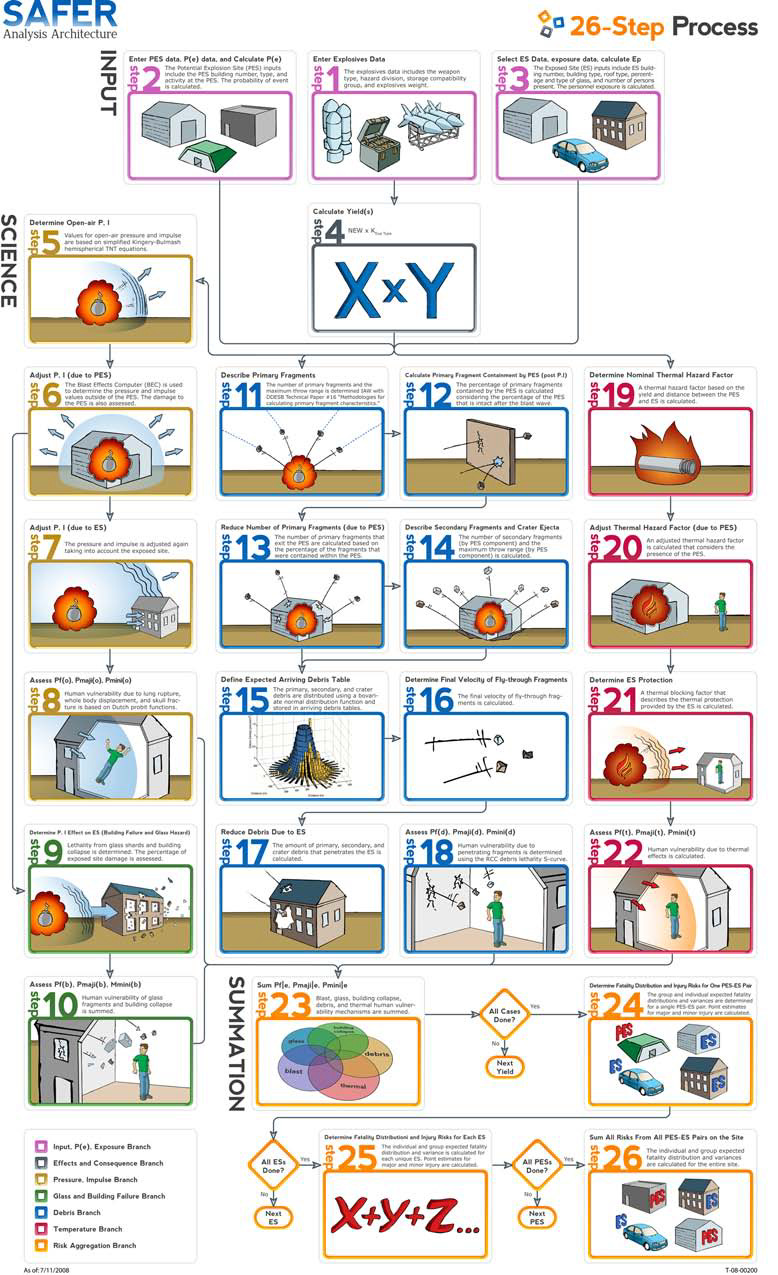 Safety Assessment for Explosives Risk (SAFER): performs quantitative risk analysis to determine risk to people from a potential explosion site (PES) by conducting a sequential calculation of the probability of event, explosives effects, and personnel exposure.