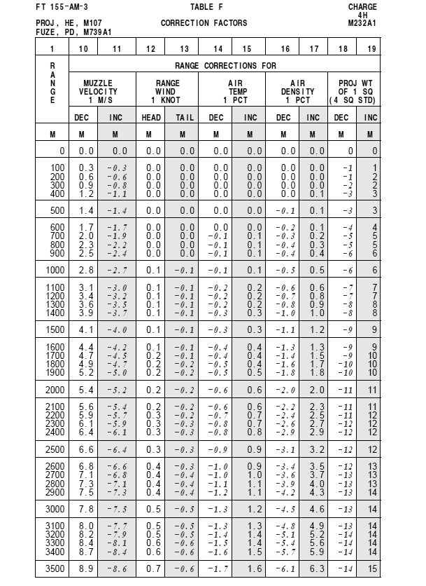 Table F in the tabular firing tables lists correction factors for the effect of nonstandard square weights. Firing tables and technical gunnery procedures allow the unit to consider specific ammunition information (projectile square weight, fuze type, and propellant temperature); thus, accurate firing data are possible. Correction for a 1 square decrease or increase in projectile weight (Columns 18 and 19). This is a correction to range to compensate for a decrease or increase of 1 square in projectile weight.