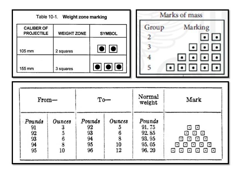 Weights. The weights of unfuzed projectiles vary from round to round, and this variation in weight will result in considerable variation in range. To help the services conveniently note these weight variations, shells are divided into weight zones. Each lot number of ammunition contains only shells of one weight zone, and more uniform ballistic results should be obtained by firing groups containing shells of the same weight zone. These weight marks are made with a prick punch and are placed in the center of squares stenciled on the projectile. The weight zones and identification marks are placed on the shell to indicate the particular weight zone for the projectile type.