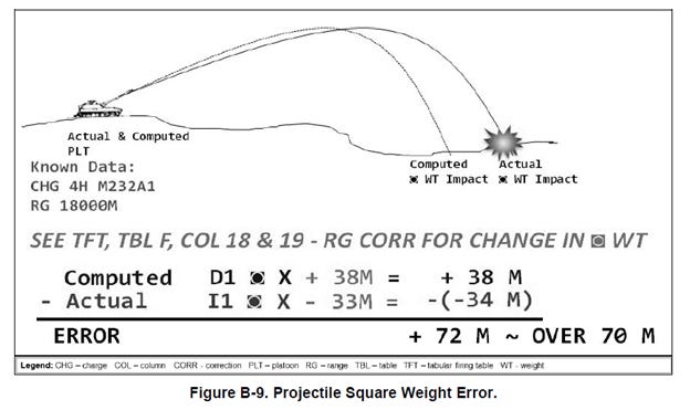 Projectile Square Weight Error. Projectile square weight allows the Fire Direction Computers to correct projectile weights on the gun line that deviate from standard. Errors in projectile square weight cause range errors for all howitzers from the fire direction perspective. Errors may also exist on an individual howitzer due to poor ammunition reporting procedures or because the howitzer fires the wrong projectile lot. The following diagram shows the importance of accurate projectile weight. The example below describes a situation in which the munitions were not verified, the automated system contained a high explosive 3 Square, but the ammunition on the gun line was 5 Square.